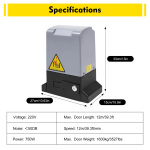 Цей пристрій для відкривання розсувних воріт використовує двигун максимальної потужності 750 Вт і його високоякісний ланцюг, щоб плавно ковзати ворота вагою максимум 3527 фунтів або 39,3 футів зі швидкістю 39,3 футів за хвилину.