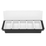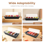 Високоякісний матеріал Цей дозатор для спецій виготовлений з високоякісного харчового АБС. Чудова міцність і твердість матеріалу ABS роблять дозатор для спецій з відділеннями стійкими до пошкоджень. Внутрішня та зовнішня коробки диспенсера-відсіку потовщені, щоб зробити їх більш міцними. Велика місткість Розмір цього диспенсера для спецій 19,7*5,9*3,93 дюйма дозволяє вмістити велику кількість інгредієнтів. Ця велика ємність ідеально підходить для сімей, щоб подавати їжу під час весняних подорожей або пікніків. Знімні внутрішні ящики Внутрішні ящики диспенсера для спецій знімні, тому їх можна легко зняти для індивідуального використання. Очищення також полегшується, якщо вийняти внутрішній контейнер. Бічна ручка Збоку відділення для видачі спецій має рифлену ручку, до якої легко дістатися. Пази добре пристосовуються до пальців і роблять захоплення нековзким і зручним. Обертова підставка Плавна обертова підставка дозволяє легко відкривати та закривати кришку для забезпечення гігієни їжі. Відсікове зберігання П'ять різних продуктів можна зберігати в п'яти невеликих відділеннях розділеного дозатора спецій. Конструкція маленьких відділень запобігає змішуванню різних продуктів.