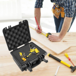 Побудований для вічності Губка, ПП, легована смола та силікон мають високу пружність і ударостійкість після лиття під тиском, тому їх нелегко зламати або деформувати, забезпечуючи безпеку внутрішніх елементів. Висока вантажопідйомність Завдяки високоміцним матеріалам і міцній конструкції цей продукт може витримати вагу 661,39 фунтів у статичному стані та 110,23 фунтів у динамічному стані, забезпечуючи безпеку вмісту всередині. Комплексний захист Два шари губки можна видовбати та вирізати відповідно до розміру предмета. Вони ідеально підлаштовуються під контури предметів, ефективно поглинають удари та забезпечують комплексний амортизаційний захист крихких речей. Хороша герметизація Герметичний край коробки забезпечує рівень захисту IP67, ефективно запобігає проникненню дощової води та пилу та захищає гарний стан предметів у коробці. Відмінний захист від крадіжки Коробка має два захисні замки діаметром 0,3 дюйма, які можна використовувати з навісними замками (не входять в комплект), щоб запобігти крадіжці. Портативний дизайн Компактний розмір (9,8*8,5*8,5*4,53 дюйма) і невелика вага (2,2 фунта) дозволяють легко носити цей виріб. Пряжки. Вони полегшують вам відкривання та закривання валізи. Силіконова ручка Вигнута ручка ергономічно лежить в руці і має нековзний малюнок на поверхні, що зменшує втому під час використання.