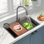 Виступна рамка на внутрішній стінці мийки забезпечує стабільне положення раковини та обробної дошки, що задовольняє ваші потреби. Висувний змішувач пропонує три режими виходу води: водяний стовп, розпилювальний струмінь та поворотний струмінь – для індивідуального ополіскування.